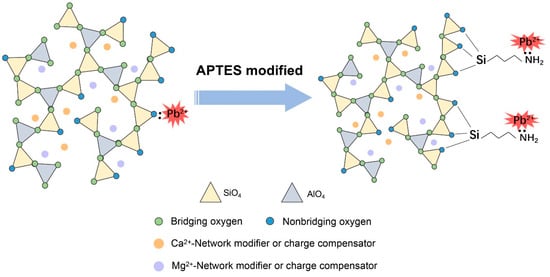 Blast furnace slag was provided by a steel plant in China. Lead nitrate (Pb(NO3)2, A.R.) was purchased from Shanghai Aladdin Bio-Chem Technology Co., Ltd. (Shanghai, China). Concentrated nitric acid (HNO3, 65%), sodium hydroxide (NaOH, A.R.) and absolute alcohol (EtOH, A.R.) were obtained from Beijing Chemical Works (Beijing, China); γ-aminopropyltriethoxysilane (APTES) was purchased from JiuDing Chemical Technology Co., Ltd. (Shanghai, China). Deionized water (H2O) with a resistivity close to 18 Ω cm was produced by a water purification system (Ulupure, Chengdu, China). All chemicals except blast furnace slag were used as received without further purification. The lead ion solution was prepared by dissolving a certain amount of Pb(NO3)2 in deionized water.