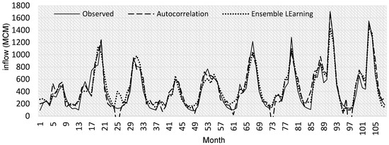As shown, the ensemble learning method, which directly forecasts inflows, performed better than the other one, which forecasts the wavelet components independently. More evaluation shows that the correlation coefficient R in the second approach has the highest value, equal to 0.962, which proves desirable estimation in terms of linearity. Additionally, the WI index behaves very similar to R, where it records a number above 0.972, which is expected. Similarly, the Nash index is estimated as 0.903, which shows satisfied regression with better performance than the first method [39]. Figure 6 visualizes the simulation of the inflow forecast for the test data according to the proposed methods.