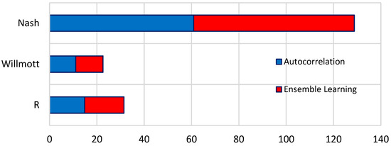 It can be seen that despite apparently desirable performances, neither method performed well in terms of peak estimation. However, the direct forecast model handled the initial data pattern better than the autocorrelation method, which estimated some sample points as a negative number. How much the preprocessing improved the evaluation indices should be noted [16]. Figure 7 indicates the percentage of improvement resulting from preprocessing divided by each index.