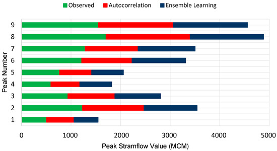 More evaluation revealed that the WI index showed the least amount of impact from preprocessing, as the greatest change in the second method was recorded, about 16%. Moreover, this process affected the indices of the second method, which could be due to the adverse effects of the detail component of the second layer. This component had a very low correlation with inflow, which caused it to be omitted during feature selection. Therefore, the absence of this parameter in the ensemble training improved learning performance. Figure 8 illustrates the peak values of the estimated inflow obtained by the proposed approaches compared to the observed data.