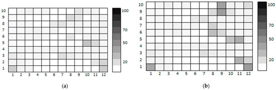 Figure 10 represents how the completed rule curves, including CPRC and CHRC, reduced the water deficit over the last ten years of the simulation period. In these figures, the non-white cells indicate the improvement in the total deficit. In other words, the intensity of the non-white cells can be determined as the difference of the total deficit between the completed and real-time rule curves. As such, the darker the cells, the more the percentage of the total deficit reduced due to the improvement in the forecast accuracy. Additionally, the total deficit variations are represented using a color spectrum. According to these figures, the total deficit was reduced more in the case of intensity reduction (darker cells) and the number of periods (number of non-white cells) following the hedging policy. This fact is related to the nature of the hedging policy, which dictates that keeping the water level high makes the rule more dependent on the forecasting terms [48]. Hence, this dependency is reflected in more variations related to higher forecast accuracy.