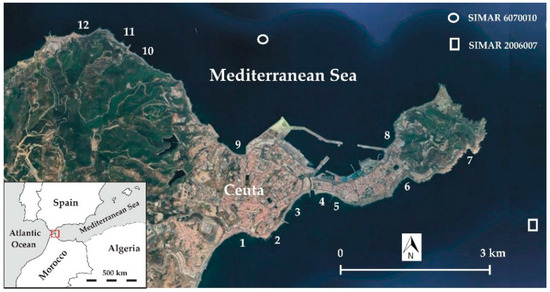 Ceuta Province, administratively belonging to Spain, is located in North Africa in the easternmost part of the Gibraltar Strait realm, which constitutes the convergence area between the Atlantic Ocean and the Mediterranean Sea (Figure 1).