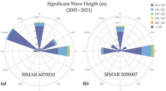 Wave roses for the investigated area (“Puertos del Estado”, www.puertos.es, accessed on 1 March 2020).