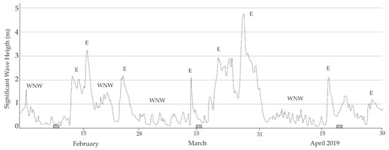 Wave characteristics, i.e., height and approaching direction during the study period, are presented in Figure 3. Significant wave height and approaching direction reflect the local wave climate with the most important storms approaching from the east (Figure 2 and Figure 3). March beach surveys were carried out after a few small storms approaching from the east and characterized by short durations and Hs maximum values of 2 m. Between March and April surveys, i.e., at the end of March (Figure 3), the most energetic events recorded during the investigated period took place because of highest Hs values and long durations. The characterization of wind, waves and currents is of great interest since such natural agents can have a significant effect on beach litter distribution as well as litter amounts and categories [56,57].