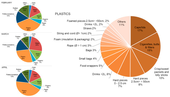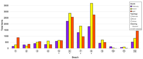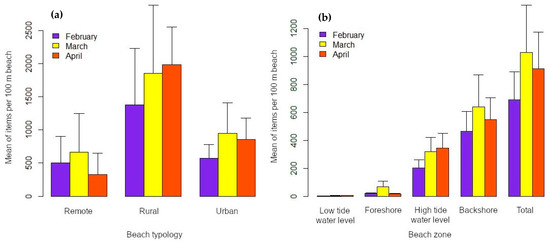 Lastly, clear differences regarding the abundance of litter by beach zone were recorded. The low tide line was where the lowest amounts of litter were counted, with mean values of 2, 3 and 4 items per 100 m of beach for the months of February, March and April, respectively. On the foreshore, the mean values were slightly higher with 19 items in February, 66 items in March and 16 items in April (Figure 5b). The bulk of litter was distributed among the backshore area and the high-tide water level, confirming some observations that were carried out in other places such as Korea [70], Japan [71] and Spain (Cádiz) [46]. The high-tide water level presented mean values of 203 items (February), 320 items (March) and 343 items (April), while the backshore area is the most polluted beach zone. In the backshore, a mean of 464 items were registered in February, 641 in April and finally, 549 in March (Figure 5b). February was the month in which the least amount of beach litter was counted, followed by April and March, the latter with the highest concentrations (mean values of 688,912 and 1030, respectively, Figure 5b).
