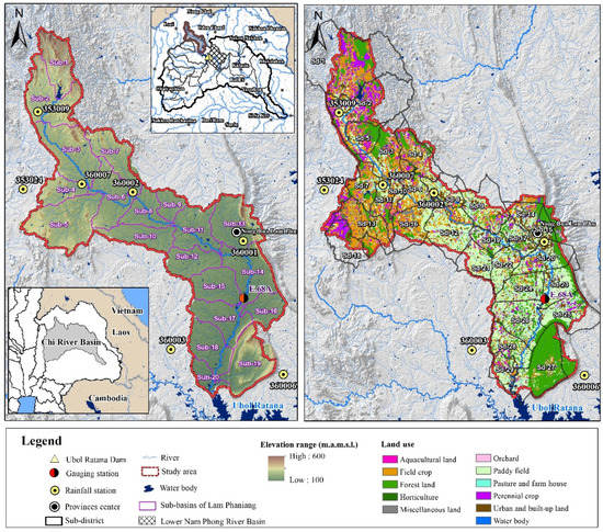 The Lam Phaniang River Basin, which is the main sub-basin of the Chi River Basin, is located in the northeastern part of Thailand. The Lam Phaniang River is the main river of the study area with the length of 150 km originating from Phu Khao Range at the eastern part of Loei Province, passing through Nong Bua Lamphu Province, and flowing into the Ubol Ratana Reservoir. The total area of the Lam Phaniang River Basin is approximately 1912 km2 (3.9% of the entire Chi River Basin) with a long and narrow S-shape, which results in a relatively small peak discharge during floods [9]. The elevation along the flow path varies from 600 m above mean sea level (m.a.m.s.l.) at the upstream to approximately 100–200 m.a.m.s.l. at the downstream end of the targeted area (see Figure 1). The 2015 land use in the study area can be classified into agricultural land covering the area of 1302.0 km2 (68.1%), forest covering 413.0 km2 (21.6%), urban and built-up areas covering 98.6 km2 (5.2%), water bodies covering 48.7 km2 (2.5%), and miscellaneous covering 49.7 km2 (2.6%). Referring to the information from Secretariat Office of the Chi River Basin Committee [10], the climate of the study area is a tropical monsoon type with 1240.2 mm of mean annual rainfall, while the highest mean monthly rainfall amount was recorded in September (237.7 mm) and the lowest was found in January (5.7 mm). The mean annual temperature was reported to be about 26.7 °C, which varies from a maximum of 36.4 °C in April to a minimum of 16.7 °C in December. The mean annual runoff was estimated to be approximately 10.1 m3/s, in which the highest and lowest runoff were observed in September and April by 49.0 m3/s and 0.1 m3/s, respectively.