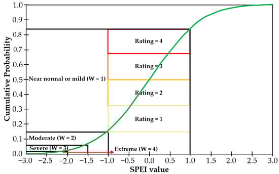 Based on the cumulative distribution function of SPEI, each drought severity category was assigned with a particular weight from 1 to 4 by considering the SPEI intervals (Table 1). In detail, the mild (M), moderate (MO), severe (S), and extreme (E) classifications were defined the weights (W) of 1, 2, 3, and 4, respectively, in which a high value indicated a high drought intensity. Thereafter, each weighted category was further divided into four rating scores (R) ranging from 1 to 4 using the Jenks Natural Breaks classification method in ArcGIS 10.5, in which the order is increased through evenly dividing the interval of the cumulative probabilities for each drought range (see Figure 2) (note: the Jenks Natural Breaks method creates ranges based on the average of each range to distribute the data more evenly across the ranges, in which the data values within each range are also fairly close together [29]).