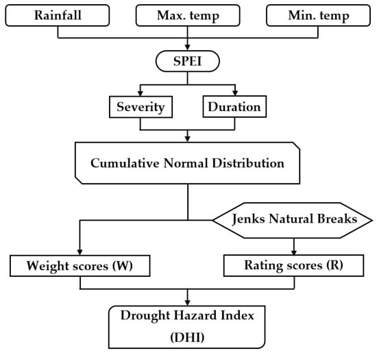 By integrating the weights and ratings of various categories using Equation (1) for seven rain gauges, the Drought Hazard Index (DHI) was then calculated for 3-, 12-, and 24-months SPEI values for 2000–2017 and 2021–2100 under both RCPs 4.5 and 8.5 (see Figure 3 for detailed procedure).