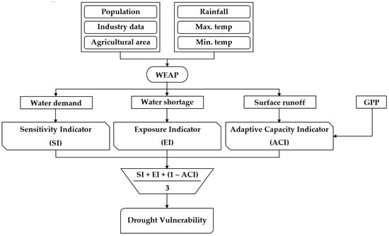 - Adaptive Capacity Indicator (ACI), which is a function of three determinants, including socio-economic, technological, and institutional capabilities, was considered since the greater the adaptive capacity of the Lam Phaniang River Basin to a specific climate event, the less vulnerable to drought due to climate change. In this study, two indicators, i.e., Gross Provincial Product (GPP) and surface runoff simulated by WEAP, were used to quantify adaptive capacity to climate change, because the higher the GPP and more sufficient the water supply are, the higher the adaptive capacity.