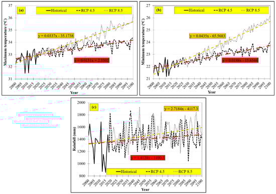 Average annual maximum and minimum temperatures (a,b), and average annual rainfall (c) under RCP 4.5 and 8.5 scenarios.