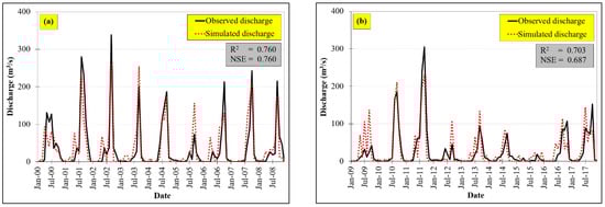 Observed and simulated monthly discharge during (a) calibration period and (b) validation period, at gauging station E.68A.