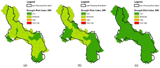 Drought risk is defined as the combination of drought occurrence and its severity, resulting from hazards that could cause physical harm to vulnerable elements (persons or property damage) [31]. Therefore, the determination of drought risk was carried out by combining vulnerability (DVI) and hazard information (DHI), since neither vulnerability nor hazard alone determines the occurrence of drought. To capture the potential drought hazard consequences, the Drought Risk Index (DRI) was calculated and used to assess drought risk for different administrative sub-districts of the Lam Phaniang River Basin (see Equation (3)). Then, the spatial distribution maps of drought risk across the Lam Phaniang River Basin were generated to identify the vulnerable sub-district areas to drought risk, using the same classification criteria as in Table 2.