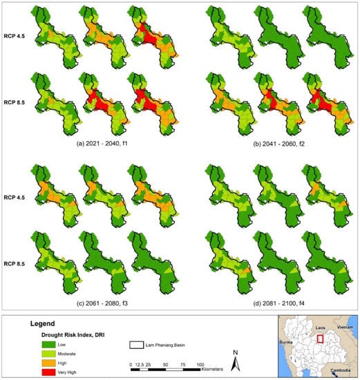 For the period 2061–2080 (Figure 8c), at the 3-month time scale under RCP 4.5, high risk was found at Na Wang District, i.e., Na Kae (Sd-3), Wang Pla Pom (Sd-5), and Wang Thong (Sd-7) Sub-districts, Na Klang District, i.e., Dan Chang (Sd-6), Fang Daeng (Sd-12), and Uthai Sawan (Sd-16) Sub-districts, and Mueang District, i.e., Nong Bua Sub-district (Sd-20), Nong Bua Lamphu Province, while the risk level at the same areas was determined to be on the moderate category under RCP 8.5. Based on the 12-month time-scale under RCP 4.5, a high risk level was only found at Na Wang District, i.e., Na Kae (Sd-3), Wang Pla Pom (Sd-5), and Wang Thong (Sd-7) Sub-districts and Mueang District, i.e., Nong Bua Sub-district (Sd-20), Nong Bua Lamphu Province, while under RCP 8.5, a moderate level was only observed at Mueang District, i.e., Nong Bua (Sd-20) and Nong Wa (Sd-22) Sub-districts, Nong Bua Lamphu Province, and the rest were low level. At 24-month time scale under RCP 4.5, the high risk level extended further from the 3-month time scale to the areas of Mueang District, i.e., Na Kham Hai (Sd-9), Non Khamin (Sd-21), Nong Wa (Sd-22), and Ban Phrao (Sd-24) Sub-districts, Nong Bua Lamphu Province, while under RCP 8.5, most of the areas were at a low level except Nong Bua Sub-district (Sd-20), Mueang District, Nong Bua Lamphu Province, which were moderate level.