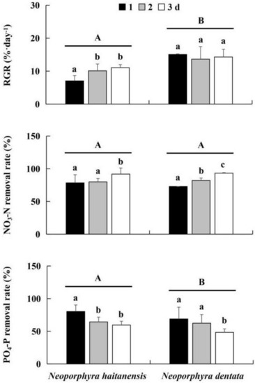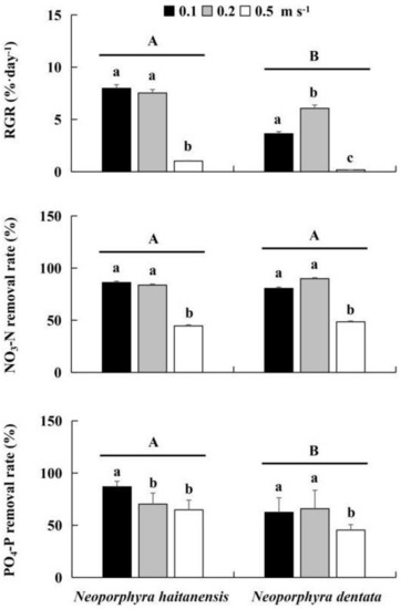 Li, J.; Cui, G.; Liu, Y.; Wang, Q.; Gong, Q.; Gao, X. Effects of Desiccation, Water Velocity, and Nitrogen Limitation on the Growth and Nutrient Removal of Neoporphyra haitanensis and Neoporphyra dentata (Bangiales, Rhodophyta). Water 2021, 13, 2745. https://doi.org/10.3390/w13192745