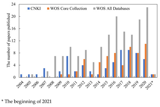 On the CNKI (China National Knowledge Infrastructure) data platform, a total of 65 valid papers were retrieved using the subjects “SU = (‘Danjiangkou’ + ‘Danjiangkou Reservoir’ + ‘Danjiangkou Reservoir Area’, and SU = (‘N’ + ‘TN’ + ‘Ammonia N’ + ‘Nitrate N’ + ‘Organic N’ + ‘Control of N emissions’ + ‘N cycle’)”. On the Web of Science data platform, a total of 164 valid papers were retrieved by searching all databases with the subjects ‘Danjiangkou’ and ‘Danjiangkou’, including 65 papers in core aggregate databases. The retrieval deadline was 17 March 2021. Since the middle line of the South-to-North Water Diversion Project was officially launched in 2014, research on the water quality of the Danjiangkou Reservoir has substantially increased, and the number of research papers on N issues in the reservoir has also increased, with the greatest number of research papers on this topic published in 2020 (see Figure 1). Table A1 provides statistics on recent research relating to N pollution in the Danjiangkou Reservoir in domestic and international journals.