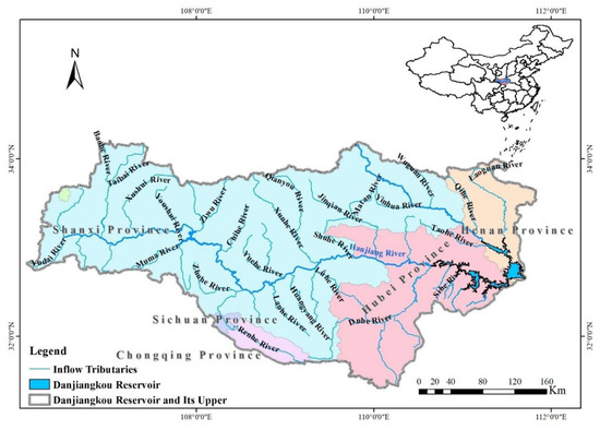 The Danjiangkou Reservoir is divided into two parts: the Hanjiang subreservoir (32°26′ N–32°52′ N, 110°38′ E–111°29′ E) in Danjiangkou City, Hubei Province, and the Danjiang subreservoir (32°34′ N–33°07′ N, 111°13′ E–111°43′ E) in Xichuan County, Henan Province. The two subreservoirs are equivalent in water surface area, the number of inflow tributaries, and catchment area size. There are 16 main inflow tributaries (see Figure 2 and Table 2), among which the Hanjiang River is the main source of water, accounting for over 90% of the inflow water amount.