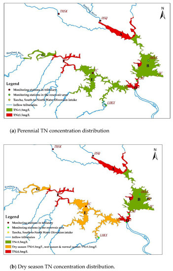 Conversely, the TN concentrations of the reservoir bay were higher in the dry season than in the wet season. Li et al. analyzed the TN concentrations in 66 reservoir bays of the Danjiangkou Reservoir and concluded that the concentrations in the dry season were higher than those in the wet season [18]. These fluctuations in the TN concentration were attributed to a slower flow rate and the weak dilution effect in local bays caused by less water during the dry season [3]. Moreover, the TN concentrations in the Hanjiang subreservoir were lower than those in the Danjiang subreservoir in the wet season, whereas the TN concentration in the Hanjiang subreservoir increased in the normal and dry seasons. This is because the water in the Hanjiang subreservoir is derived mainly from the Hanjiang River, which accounts for >75% of the total water inflow into the reservoir, and pollutants in the Hanjiang subreservoir experience varying degrees of dilution during the wet season [3].