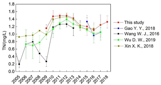 Since the 1990s, the TN concentration of the Danjiangkou Reservoir has shown an upward trend of fluctuation, which peaked in 2000 [14]. According to document statistics (Figure 4), in 2010, the TN concentration showed a marked increase of about 0.4 mg/L in the Danjiangkou Reservoir, and this high concentration was maintained from 2010–2013 and has decreased to approximately 1.25 mg/L since 2014. Specifically, the TN concentration at Taocha, the water diversion intake, improved significantly and was classified as Class III, whereas the remaining sections of the reservoir maintained a Class IV classification. The TN concentration was monitored by our team at four monitoring points of the reservoir, as shown in Figure 3a, and showed a general increasing trend before 2013, and a decreasing trend after 2013, with significant interannual fluctuations. This observation was consistent with the relevant research results and conclusions on TN concentration fluctuations in this reservoir.