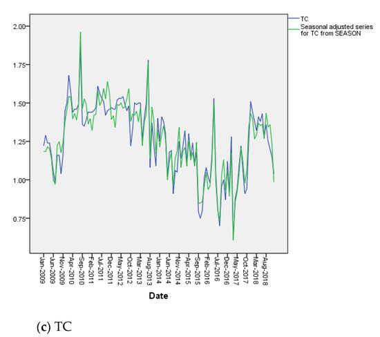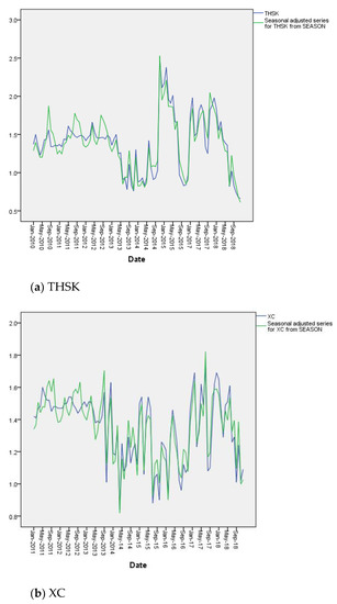 Time series analysis is necessary to exclude seasonal variations in the time series characteristics of the monitored data. The seasonal decomposition model in SPSS software was used. Time series analysis was conducted on the TN index (monthly average data) of two monitoring stations in the inflow tributaries (THSK, XC), and the South-to-North Water Diversion intake (Taocha), and Figure 5 shows the original series and the series corrected for seasonal factors. The results show that the seasonal effect is not significant in the time series. Figure 6 shows the monthly variation trend of the TN concentrations in two inflow tributaries (THSK, XC) and Taocha without seasonality (2009–2018).