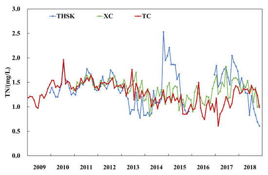 Monthly variation trend of the TN Concentrations in two inflow tributaries (THSK, XC) and Taocha without seasonality (2009–2018).