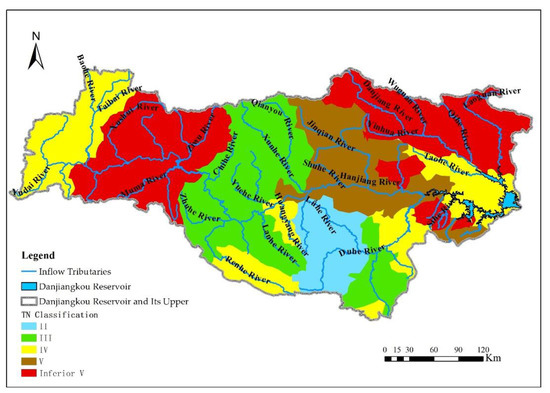 The main sources of N in the Danjiangkou Reservoir are the inflow tributaries, nonpoint source pollution around the reservoir, endogenous release, and atmospheric N deposition. In general, TN pollution in tributaries is more prominent and is the main source of high TN concentrations in the Danjiangkou Reservoir [15]. Moreover, TN pollution is primarily sourced from nonpoint sources in the area. Moreover, rivers characterized by high TN concentrations are typically classified as Class V areas, for example: the Laoguan River watershed in Henan Province; the Danjiang River watershed in the Shaanxi and Henan provinces; the Shending, Sihe, Jianhe, and Zhihe rivers and other watersheds in Shiyan City in Hubei Province; the Tianhe River in Xunxi County in Hubei Province; and the Hanjiang River watershed and its tributaries flowing through Hanzhong City in Shaanxi Province. Numerous studies have shown that the Hanjiang River is greatly affected by point source pollution, while the Danjiang River is markedly affected by nonpoint source pollution.