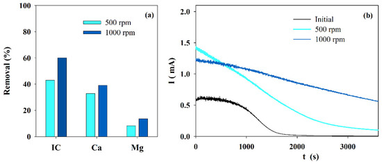 Figure 1a presents the IC and calcium and magnesium ions removal obtained during electrolysis performed with solution S at different stirring speeds.