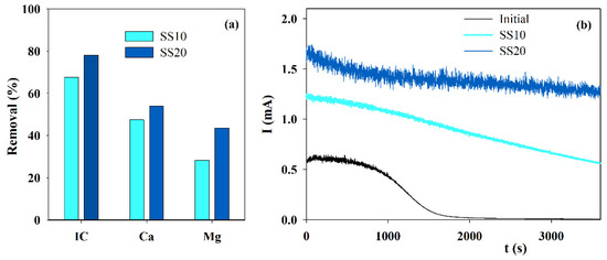 Influence of the cathode area on the (a) IC, Ca2+ and Mg2+ removals, during electrolysis (I = 0.1 A; Anode—BDD 20 cm2; Cathode—SS, 10 or 20 cm2; Stirring speed—1000 rpm; 4 h), and (b) chronoamperometric tests (E = −0.96 V vs. Ag/AgCl) run with S solution, before and after the electrolytic assays performed using different cathode areas.