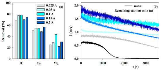 Although EE assays were run at applied current intensities ranging from 0.025 to 0.5 A, it was observed that smaller currents were better to attain the expected results. Thus, only the results obtained at current densities ranging from 0.025 to 0.2 A are presented in Figure 3. When the removals in IC and Ca2+ are compared, similar results are observed for current intensities of 0.05, 0.1, and 0.2 A. However, the best results for Mg2+ were attained at 0.1 A. This higher Mg2+ removal has an enormous influence on the chronoamperometric curve since this curve shows assuredly the best behavior because almost no reduction in the current is observed during the accelerated scaling test. The current intensity of 0.1 A, which corresponds to a current density of 100 A m−2, was also the best experimental condition found in literature research [30]. According to those authors, this must happen because the process is diffusion-controlled higher applied currents are a waste. Higher currents can increase hydrogen evolution that may even hinder solids’ deposition.