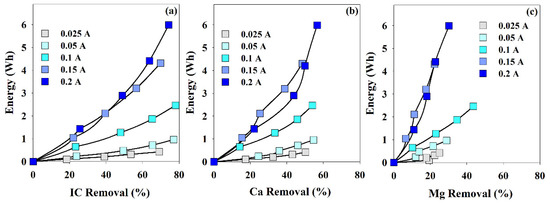 Energy consumption vs. removal percentage of (a) IC, (b) Ca2+ and (c) Mg2+, during the assays performed at different current intensities. I = 0.025 to 0.2 A; Anode—BDD 20 cm2; Cathode—SS 20 cm2; Stirring speed—1000 rpm; 4 h.