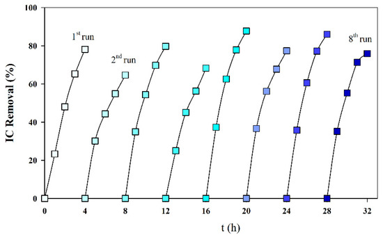 To study the influence of the cathode deposit on the reproducibility of the IC removal, eight consecutive assays were run, with fresh S solutions, without cleaning the cathode deposit formed in the previous assays. Figure 6 presents the obtained results, and it can be observed that the deposit formed did not significantly influence the IC removal. This is a good evaluation for the process scale-up since it is not necessary to clean the cathode often.