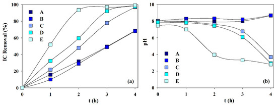 Figure 7 presents the IC removal and pH variation during the electrolytic assays performed with solutions A to E. It can be observed that IC removal increases with calcium ion content and decreases with magnesium ion initial concentration. This must be due to the lower solubility product of the calcium carbonate (8.7 × 10−9) than that of the magnesium carbonate (4.0 ×10−5). Regarding pH variation (Figure 7b), for solutions A and B, with none or low calcium content, and both with low IC removal, the existence of high carbonate concentration makes the carbonate buffer effect important, thus keeping a constant pH value. However, when calcium concentration is increased, in solutions C, D, and E, the lower calcium carbonate solubility product makes carbonates precipitation easier, as magnesian calcite, and the buffer effect is reduced and even nullified happens for solution E after 1-h electrolysis. These observations indicate that carbonate removal by electrolysis increases with the Ca/Mg molar ratio.