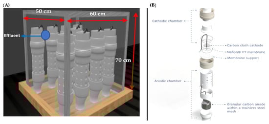 Stack Setup: (A) Assembly for 9 cells; (B) MFC components []. Reproduced with permission from Rodrigo Valladares Linares, Water; published by MDPI, 2019.