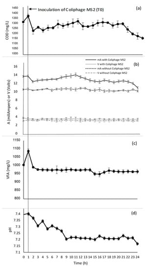 Two replications of the bioelectrochemical treatment system were performed for the coliphage MS2. The scaled-up bioelectrochemical system required an external electronic card [] to extract and use the electrons from molecules present in the wastewater, as well as the treatment of the coliphage MS2. The system was monitored every hour for 24 h to identify the reduction of both organic matter and coliphage MS2. The values obtained from the physicochemical and electrochemical parameters can be seen in Figure 2.