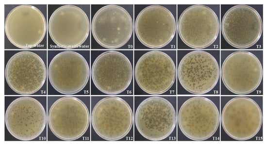 The scaled-up bioelectrochemical system had a working volume of 167 L and was inoculated with the recovered volume, giving an initial coliphage concentration of 6.89 × 107 PFU/mL of the treatment (T0). The negative controls, synthetic residual water, and tap water with which it was prepared presented a complete and intact bacterial plate, as shown in Figure 3 (Petri dishes), unlike T0, where many hydrolysis points were caused by the bacteriophage. Bacteriophage removal by the bioelectrochemical treatment system was more noticeable from 6 h after the start of treatment; after 15 h (T15), there were no hydrolytic spots on the bacterial plaque.