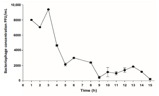 The kinetics could be not quantified up to 24 h because after 15 h, there was an excessive growth of yeast in the system and the PFU could only be quantified up to that time. In order to solve this problem inherent to the treatment system, it was decided in the following experiment to filter the sample water before plating. Since two replications of each box were made to obtain the average PFU/mL at each time-point, it was observed that there were variations in the number of PFUs per plate. However, despite the variations, the reduction in the PFU/mL at 15 h (T15) was evident (Figure 3).