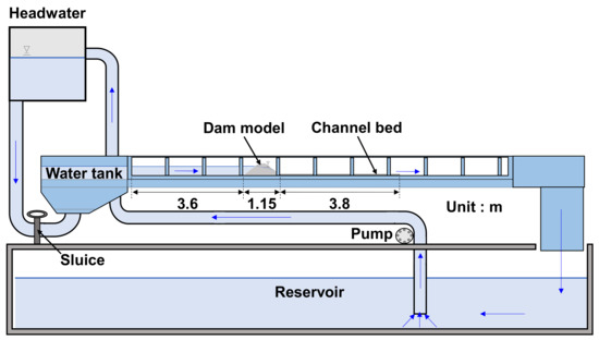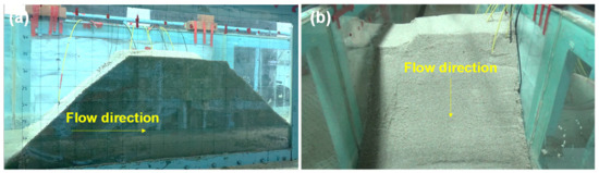The laboratory flume is shown in Figure 1, which is the same equipment used in Feng et al. (2020b) [32]. The size of the flume is 15 × 0.6 × 0.6 m and the slope of the channel bed is 0.1%. The pump is mainly used to pump water from the underground storage tank to the headwater. Water is introduced from the headwater into the water tank and controlled by a sluice (a valve). The inflow is regulated by a screening device before flowing into the flume channel to enable stable flow conditions. The design of the water supply setup is similar to that of Alhasan et al. (2016) [41] in that the water was stilled/regulated before entering the flume channel. Dimensions of the dam model are listed in Table 1. The slope of the dam is 1:1 (45°) before water impounding. After the construction of the dam model, it was left to sit for 1 h before the test. This study assumes that the right side of the flume is an axis of symmetry; therefore, an overflow notch of 0.05 m depth was set on the right side of the flume. The material used to construct the dam model was sieved uniform sand with a median particle diameter of D50 = 1.5 mm, D10 = 0.9 mm, and D90 = 12.1 mm. The unit weight of the dam material averaged 13.93 kN/m3 and the density of solid particles ρs = 2583 kg/m3. The void ratio was 0.816 and porosity 45%. The initial moisture content of the dam materials was measured as 5–8%. The initial internal friction angle of the dam material was estimated to be 38–40°. A sand bed with a length of 3.8 m and a thickness of 0.05 m was placed downstream of the dam (Figure 1). Figure 2 shows the side and front view of the dam model.