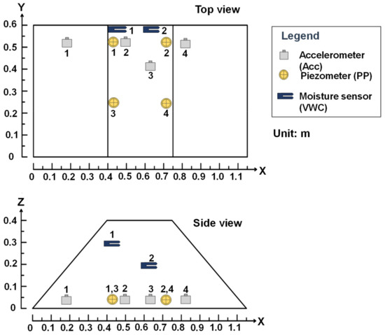 The dam model was instrumented with sensors including 4 accelerometers, 4 piezometers, and 2 moisture sensors. Figure 3 shows the configuration of the sensors in the dam model and are numbered for identification. The locations of the sensors were selected so that they are not washed out during the tests. Therefore, they were mostly installed on the left side of the dam, with the exception of PP-3 and PP-4. The piezometers were installed close to the bottom of the dam to reflect pore pressure. Moisture sensors 1 and 2 were installed higher, at 0.2 and 0.3 m above the bottom to detect when the seepage water reached those levels. The accelerometers were of the Type 731A produced by Wilcoxon Sensing Technologies with a response frequency between 0.1 and 450 Hz and sensitivity of 10 V/g. The sampling rate was set at 5.12 kHz for the accelerometers to record seismic signals. The piezometers were of the Type KPE-200KPB made by Tokyo Measuring Instruments Laboratory Co, Ltd., and were installed 3 cm above the bottom of the dam model to trace pore pressure (PP) variation during the test. The moisture sensors were of the Type EC-5 produced by METER Group, Inc., and were installed at two different levels to monitor variation in volumetric water content (VWC).