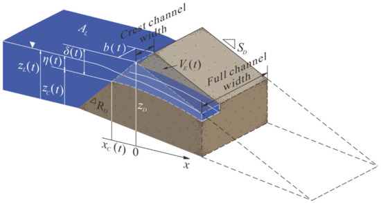 where is a dimensionless transport coefficient; is the local discharge (the discharge through the breach); S is the channel gradient, which can be written as the derivative of channel elevation in the streamwise direction. By substituting (2) into (1), a variable rate diffusion equation can be obtained. Next, we assumed the outflow channel at the toe of the dam converges to the initial shape of the dam, and the level of the crest level evolves along with the water level of the lake. A zero-sediment flux is assumed at the crest () as the second upstream boundary condition [47,48]. By defining operational time , the varying rate diffusion equation can be reduced to a standard diffusion equation: