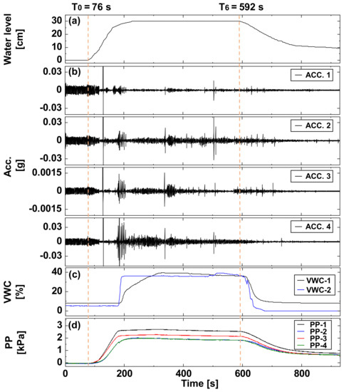 Figure 5 shows the tank water level, the signals measured by the accelerometers, piezometers, and water content sensors. The tank level gradually increased from T0 = 76 s (Figure 5a). When the water reached the dam slope, some shallow surface sands started to slide down after 150 s as the water level rose. The slope of the upstream face of the dam was slightly reduced to about 40°, but no serious deep sliding occurred. During the test, the upstream face of the dam was still stable. The pore pressure of PP-1 started to increase at about T = 100 s (Figure 5d). The volumetric water content measured by VWC-2 began to increase at T = 176 s (Figure 5c) because the seepage water had reached the level of VWC-2 at 0.2 m. The elevation (0.3 m) of VWC-1 was higher than that of VWC-2 so that there was about 10 s lag at T = 166 s for VWC-1 to detect the seepage water. When overtopping occurred at T6 = 592 s, the pore pressures and volumetric water contents began to gradually decrease simultaneously. Therefore, we confirmed that the piezometers and the moisture sensors can accurately reflect the rising and falling of the water inside the dam.