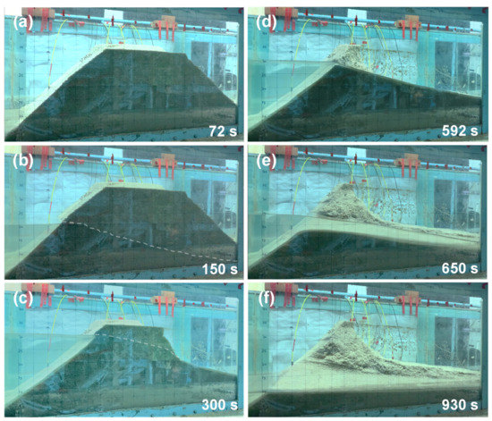 Referring to Figure 6, six side-view images were captured to show the overall test processes: (a) at 72 s (T0), the water reached the toe of the dam. The tank level was still zero. (b) At 150 s, the tank level had increased and water seeped into the dam. Once the water seeped out of the downstream surface of the dam, retrogressive erosion commenced and induced slides that gradually eroded the dam towards the upstream crest until overtopping. (c) At 300 s, the tank level was controlled at 0.3 m. Retrogressive erosion continued with many slides at the downstream slope of the dam. (d) At 592 s (T6), overtopping occurred and the dam became a triangular shape. (e) At 650s, the tank level was reduced to 0.24 m and the breach was downcut and widened due to overtopping flow. Lateral slides also occurred. (f) At 930 s, the test was ended. Overtopping flow stopped. The tank level was the same as the crest level.