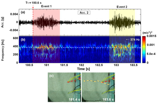 Figure 7 shows two seismic signals (Events 1 and 2) induced by two cracks, Cracks 1 and 2, the corresponding time–frequency spectrum, and the top view of Cracks 1 and 2. The occurrence time of the two signals was 180.6 s (T1) to 181.3 s and 182.8 to 183.5 s, respectively. The two signals are recognized as precursor signals prior to a slide, because a large slide, Event 3, occurred immediately after these two signals. The major seismic frequency of Event 1 and 2 was analyzed as 374 Hz, as shown in Figure 7b, and heavier energy traces in dark red can be observed near 374 Hz. This very high frequency is likely due to the particulate sands sliding on or colliding with each other during the crack development. The duration of Event 1 is about 0.5 s corresponding to the shorter crack length of Crack 1, while the duration of Event 2 is longer at 0.7 s corresponding to the longer Crack 2. From these results, we know that seismic signals induced by precursor events can be properly recorded and very useful for application to landslide prewarning.