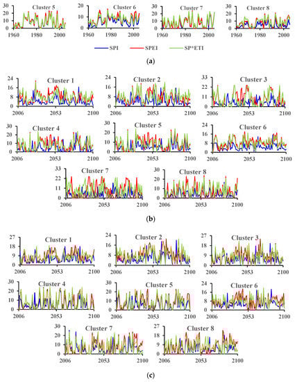 - Three drought indices (SPI, SP*ETI, and SPEI) in the historical period are close, diverging in the future period.
