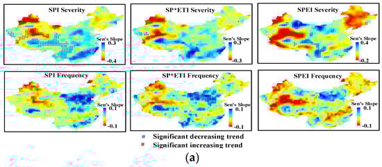 Generally, the variation trend of drought severity and frequency in China in the 21st century is not obvious, but the local variation trends are much more significant. Drought in most parts of Xinjiang Province(73°40′ E–96°23′ E, 34°22′ N–49°10′ N), Northern Tibet(78°25′ E–99°6′ E, 26°43′N–36°31′ N), and Western Qinghai Province(89°24′ E–103°4′ E, 31°24′ N–39°4′ N) show a significantly increasing trend. Drought in the North China Plain and China’s southeastern coast shows a decreasing trend.
