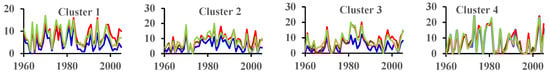 From 2006 to 2100, the temperatures of the cluster areas under RCP 4.5 and RCP 8.5 are shown in Figure S6. The temporal variations in the cluster averages of precipitation and potential evapotranspiration under RCP 4.5 and RCP 8.5 are shown in Figures S7 and S8. Temperature and PET under both RCPs obviously increase (Table 2). Except for Cluster 4 and Cluster 5, precipitation in other areas shows an obvious increasing trend. In addition, under RCP 4.5, the Sen’s slope of PET is higher than that of precipitation only in Cluster 1, Cluster 4 and Cluster 5. Under RCP 8.5, the Sen’s slope of PET is commonly higher than that of precipitation except in Cluster 2 and Cluster 3.