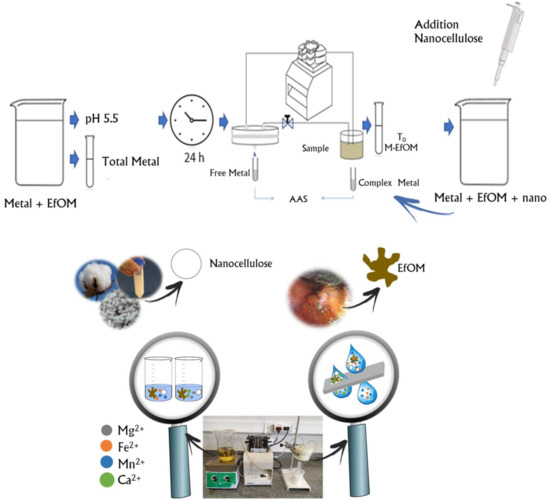 Solutions were prepared with the metals at a concentration of 2 mg L−1, and 300 µL of the suspension containing NC was added. This mixture was left to stand for a period of 24 h to form metal—NC bonds. A sample was collected to quantify the total metal present in each solution, the tangential ultrafiltration process was performed, and then EfOM was added at a concentration of 100 mg L−1. Aliquots of the filtrate were collected from time to time during the 24 h period.
