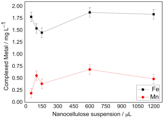 Metals complexed with nanocellulose as a function of the addition of the nanoparticle suspension in the absence of organic matter after 24 h of complexation. pH 5.5. Metal: Fe(II), Mn(II) (2.0 mg L−1). Nanocellulose: 0–1200 µL.