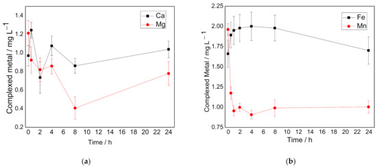 With the addition of NCs to the system, competition between ligands occurs. Complexed metal is represented as M—NC and/or M—EfOM. The influence of the addition of NC to the metal—EfOM complex indicated that iron ions are still complexed, probably to EfOM. Depending on the time of concentration of the complexed Ca, the Mg and Mn decreased, indicating that the metal was supplied in a solution (Figure 5a).