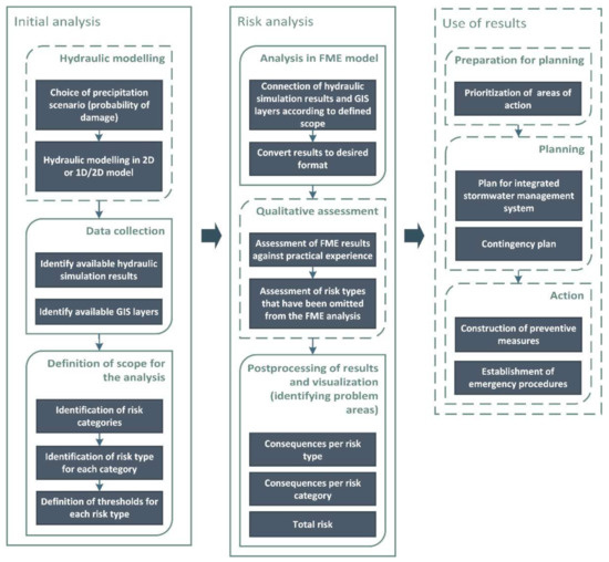 The method for risk analysis developed and tested in this study was based on hydraulic modelling (Figure 1). Thus, when starting a risk analysis, it was necessary to identify for which precipitation scenario (probability) and for which associated risk categories the consequences are to be assessed [26]. A survey of the municipal map database was made to identify map layers that are available for analysis. Based on this information, risk types for each risk category [14,19] were identified. The definition of damage thresholds for different types of risk was based on a literature study [20,21], with some adaptation to available data and local knowledge. A GIS-based spatial overlay analysis that included and weights all available datasets was set up in the Feature Manipulation Engine (FME) software [27]. All potential risks cannot always be identified quantitatively, and there is still a need for qualitative assessment of specific risk categories [16]. However, because of good data access in this study, quantitative analysis was considered sufficient to obtain a reliable result, and a qualitative follow-up was not included in this study. ArcMap [28] was used to visualize consequences per risk type and per risk category as well as total risk at a given probability. Finally, an online ArcGIS tool [28] was developed to visualize the results for decision makers. The use of results was not a part of this study.