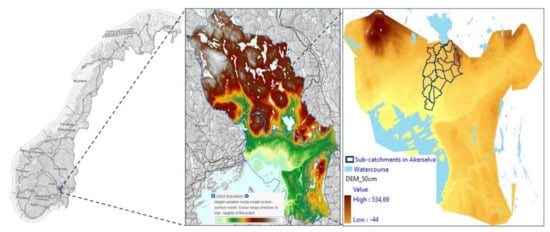 Oslo is characterized by significant variations in the terrain. While the downtown area in Oslo is at sea level, the upper edges of the city are at elevations of 200–500 masl. Annual precipitation at the central MET office station is 780 mm [29]. The wastewater network in Oslo has a total length of 2250 km [30]. Approximately 55% of the wastewater network in Oslo is combined sewer system (CS). The network includes 218 combined sewer system overflows (CSOs) that discharge into the city’s watercourses and the Oslo Fjord. Historically, there were 353 km of open streams and rivers in the Oslo area. However, 66.8% of stream routes have been piped or buried. Some of them are now part of the drainage and sewer systems, but others are entirely buried. A total of 10 rivers and streams with natural catchments flow through urban parts of Oslo before being discharged into the fjord. The study method and the tool were first tested for one of the main river catchment areas, Akerselva, with a substantial local flood knowledge base before it was implemented for the entire city [9] (Figure 2).