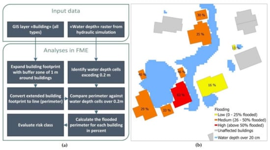 Flow chart for calculation process in FME (a); percentages of building perimeters flooded with associated risk classes (b).